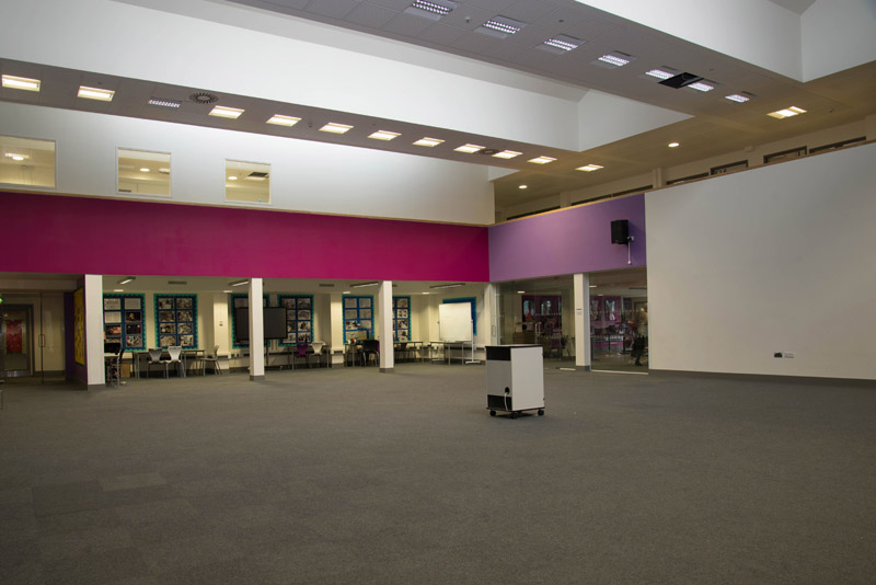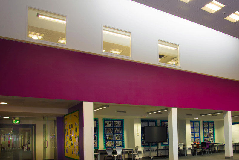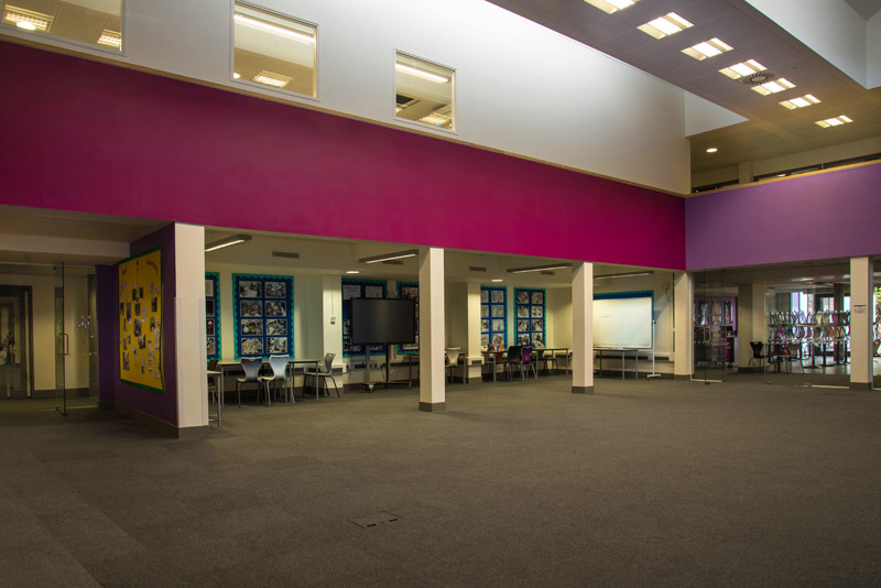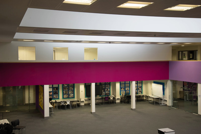 The combination of double layer sound block partitioning and thick glazing meant the reverberation in the new rooms could be suitably absorbed. Furthermore, the new rooms now act as a practical sound barrier between the open plan hall below and the corridors. The additions have made a significant impact on the sound quality in the hall, neighbouring classrooms and the corridor.